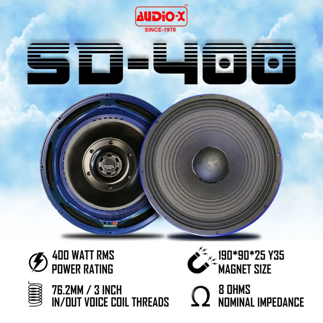 Experience crystal-clear sound and deep bass with the Audio-X SD 15-400, engineered for DJs, event setups, and professional audio applications. Built with high-quality components and durable design, this 15-inch speaker delivers the perfect balance of power, clarity, and reliability.