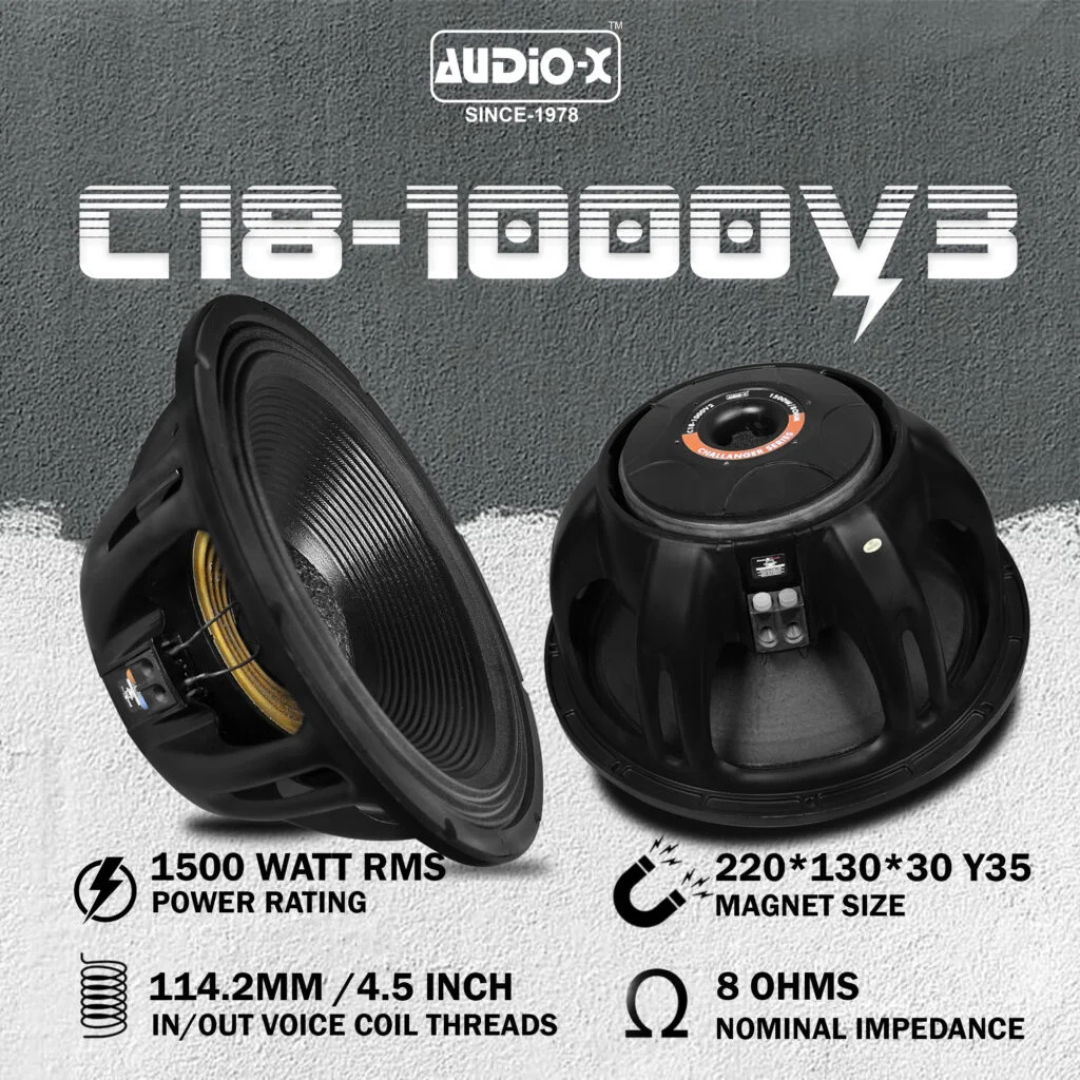 The Audio-X 18″ C18-1000 V3 (Triple Spider) is built for professionals who demand superior performance, consistent power handling, and enhanced stability. With its advanced suspension system, high RMS rating, and robust magnet-coil configuration, this speaker stands out as one of the most reliable and powerful drivers in its class.